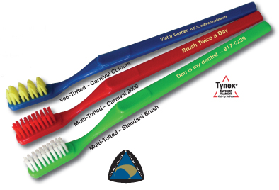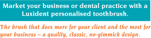 Luxident personalised brushes can be moulded and tufted in the colours of your choice with your business name and phone number printed on the front of the handle and on the back of the convenient travel pack. Or convey a message, whether it’s an oral health slogan or a holiday greeting.